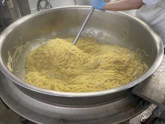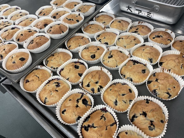 スパゲティは、油で炒めた玉ねぎと一緒に合わせ、くっつきにくいように配缶しています。乾麺の状態で50kg以上を使用するので、できあがりは130kg以上になりました。ブルーベリーマフィンは、冷凍ブルーベリーをたっぷり使用して作りました。きれいに膨らんでクラスでも大人気でした。