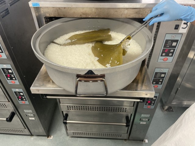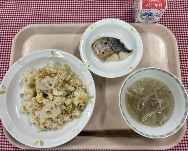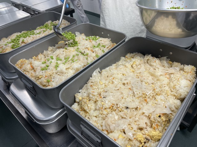 五目ちらし寿司は、ごはんを炊くときに昆布を炊き込んでいます。炊けたらすし酢を混ぜ、具と炒り卵を混ぜ込み、クラスの食缶に配缶後に酢れんこんと枝豆をちらしています。華やかな仕上がりになりました。元気が出るスープは、にんにくを炒めてから鶏ガラスープを入れ、具材を煮こんでいます。コクのあるスタミナたっぷりのスープでした。
