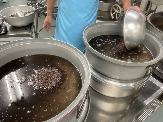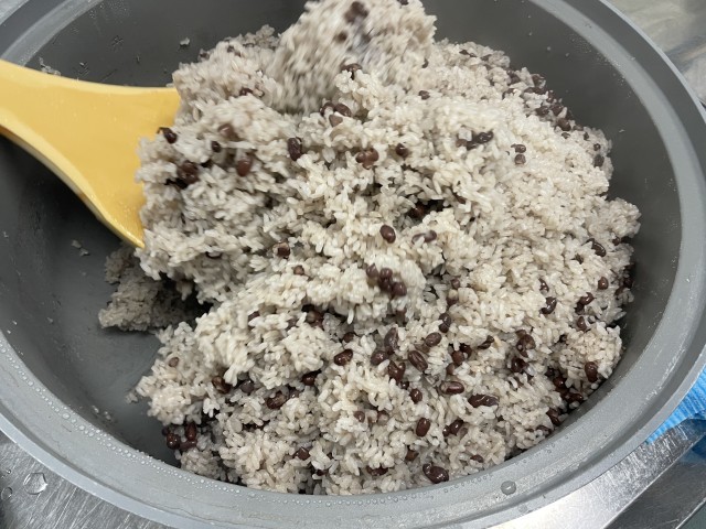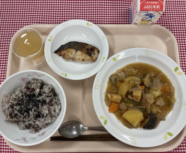 今日は、明日の開校記念日をお祝いしてお赤飯を炊きました。上にはごま塩を振っています。和の味付けの魚の西京焼きや肉じゃがとも相性がよく、ごはんが進みました。