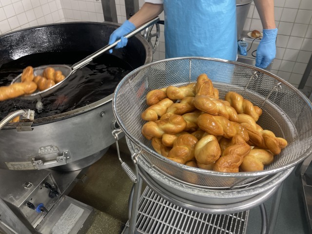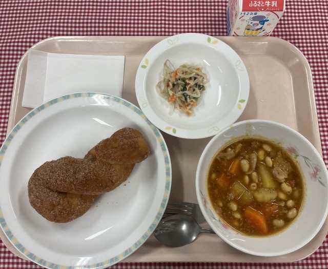 大人気揚げパンのシナモン味でした。グラニュー糖にシナモンを混ぜて揚げたてのパンにまぶしています。甘いパンとしょっぱい系のおかずの相性も良かったです。ポークビーンズは大豆たっぷりでしたが、おかわりしてくれる子もたくさんいて嬉しかったです。
