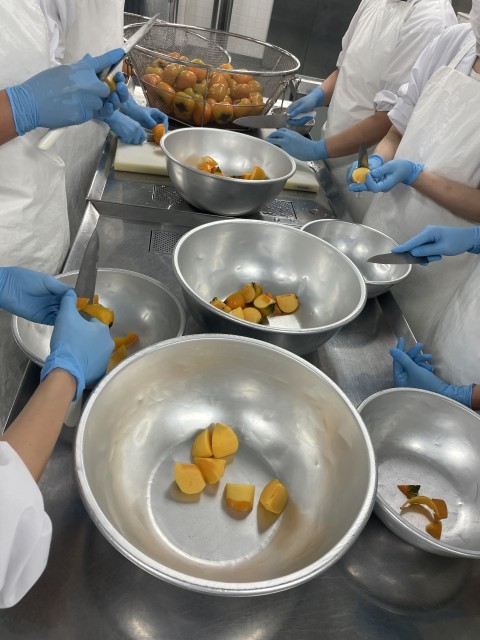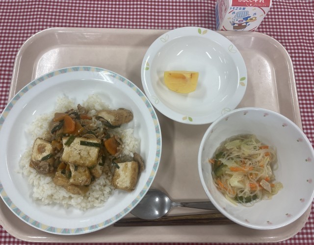 今年も柿の季節がやってきました。130個を超える数の柿の皮を丁寧にむいてくださっています。家常豆腐丼は中国で日常的に食べられている料理です。たっぷりの生揚げが入るみそ味の炒め物です。栄養満点の丼をモリモリ食べてくれました。