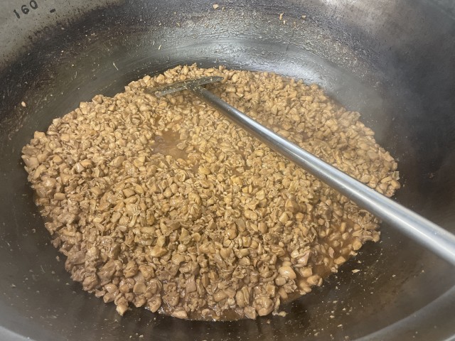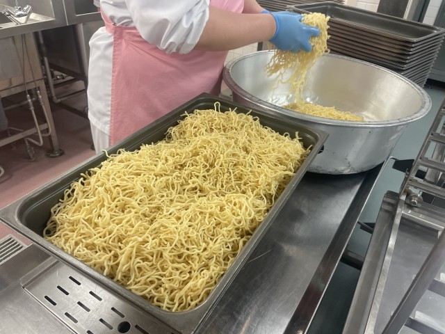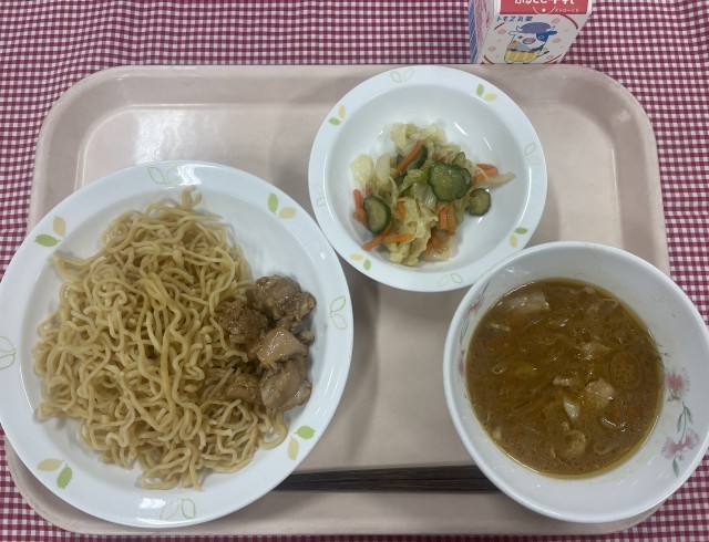 みそラーメンは、今回はつけ麺バージョンです。麺は油がまぶされていますが、しっかりほぐしてから蒸して提供しています。鶏肉で作ったチャーシュー風も一緒にモリモリ食べてくれました。