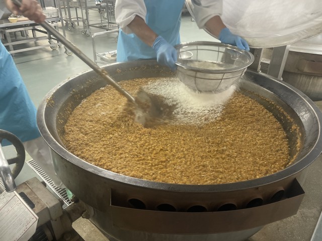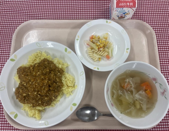 物語給食でした。柚木麻子さんの『ランチのアッコちゃん』から、みっちゃんのドライカレーと東京ポトフをアレンジして提供しています。写真にもありますが、ドライカレーは小麦粉を振り入れてとろみをつけています。今回マカロニサラダのマカロニの形を変えています。フジッリ型だとくっつきにくくて配膳がやりやすそうでした。