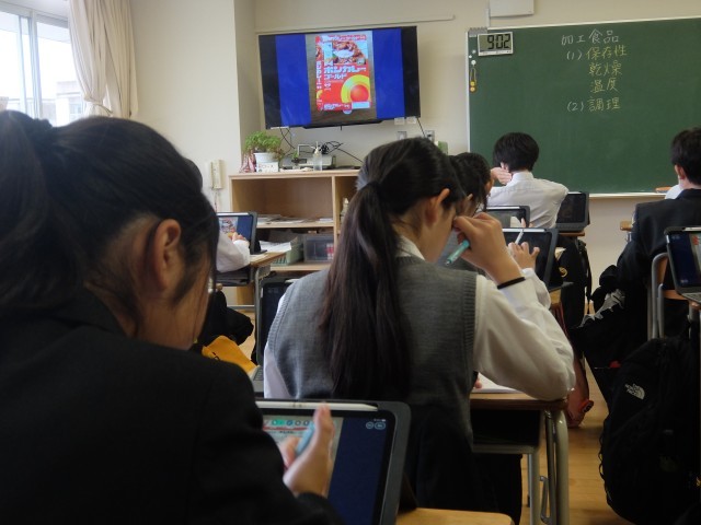 1年生の家庭科の授業にお邪魔しました。加工食品について学んでいましたが、知識があるのとないのでは、商品の見方も変わるなと感じました。