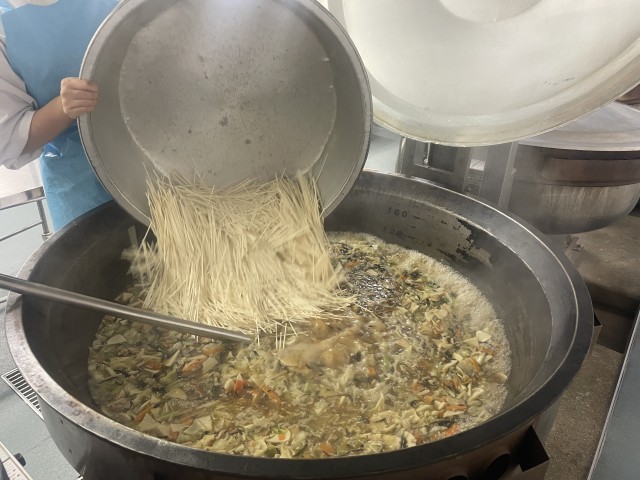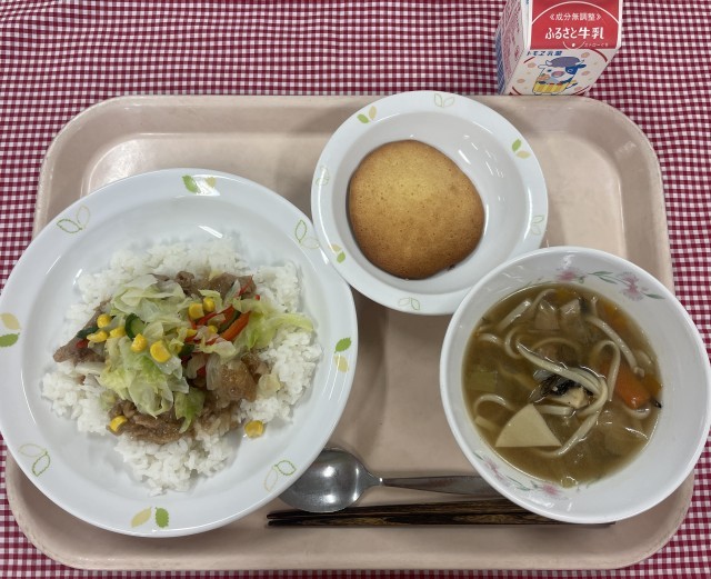 今日は佐賀県の郷土料理です。ごはんに炒めたお肉とゆで野菜をのせて食べるシシリアンライスはごはんが進みつつ野菜でさっぱりと食べることができました。たろめん汁にはうどんが入っています。どの料理もとても人気でよく食べてくれました!