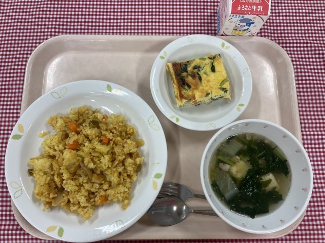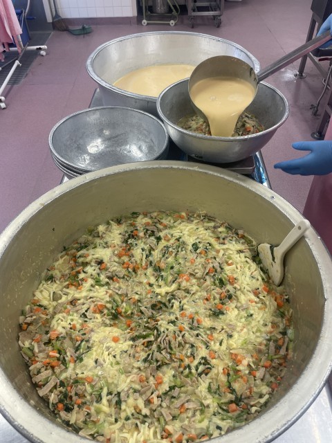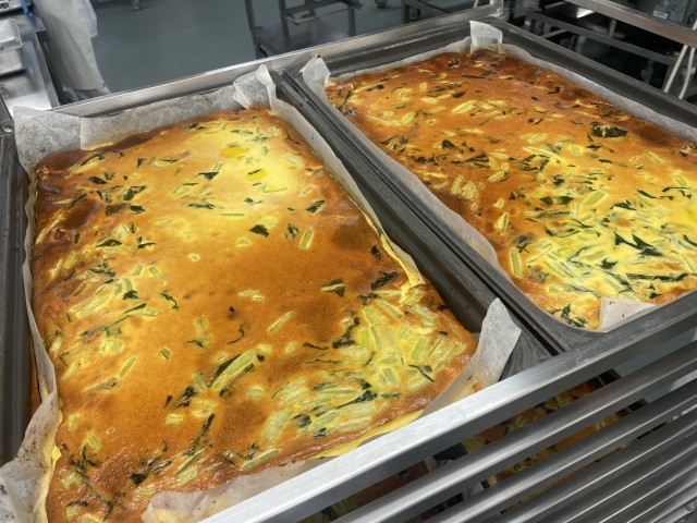 キッシュの具と卵液をそれぞれ量って混ぜ合わせ、焼いています。こんがりといい色に焼き上がりました。