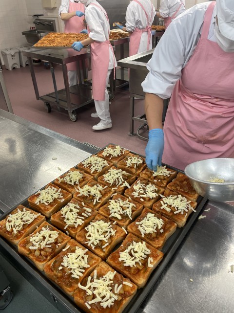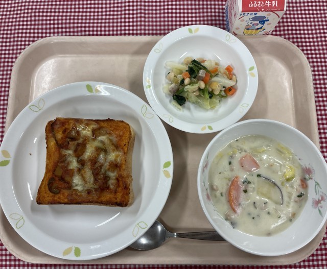 シーフードピザトーストには、イカとホタテが入っています。トマトソースで煮て、うまみたっぷりのトーストになりました。旬の白菜やさつまいもがたっぷりのクリーム煮も栄養満点です。しっかり食べて体調を整え、定期考査に挑みましょう!!