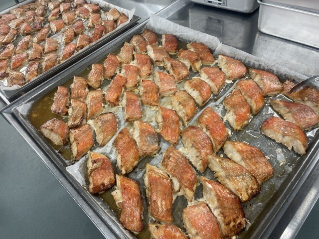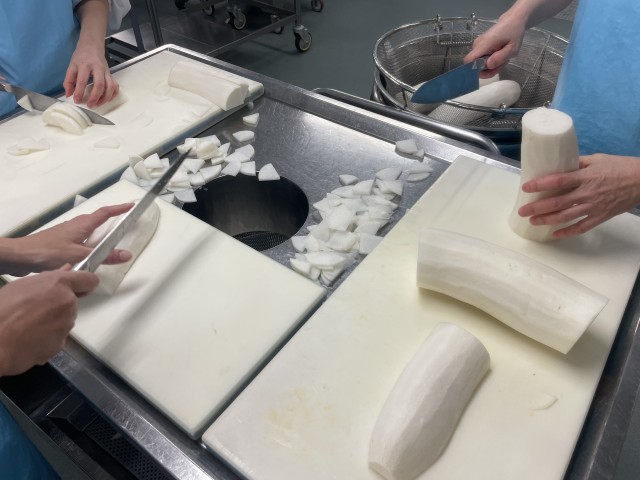 岡山県の郷土料理献立です。今日の鍋に入る青首大根はせたがやそだちのものを使っています。新鮮でみずみずしくやわらかで、切っているだけでも分かるほどでした。魚は金目鯛を使っています。身がやわらかく、うまみもたっぷりでした。