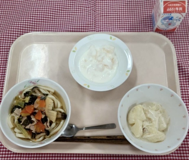 肉うどんは去年より肉の量を増量しています!つるんと食べやすく、モリモリ食べてくれました。カルボナーラポテトは、蒸したじゃがいもを生クリームや粉チーズで和えています。黒こしょうもアクセントで利いています。