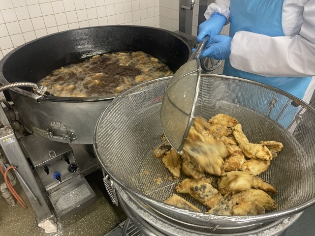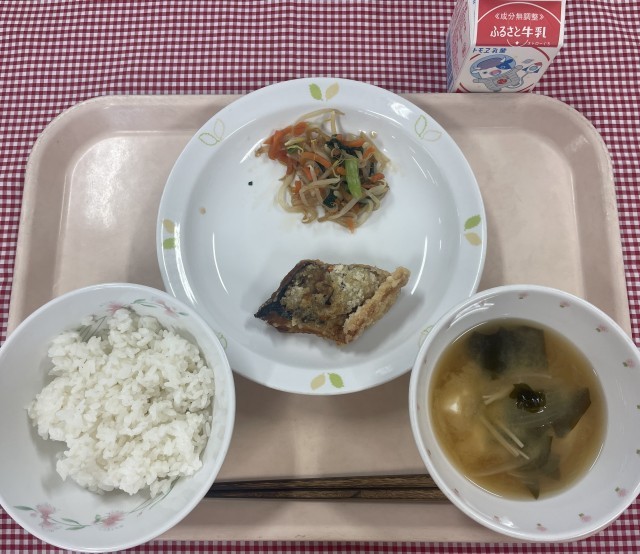 今日は学び舎の日に合わせて「学び舎給食」を提供しています。今回は希望丘小学校の献立です。脂ののったさばを揚げて、しょうがとだしの効いたたれをかけています。ごはんは有機米です。ほかほかと湯気の立つごはんは甘みがあり、さばの味付けでますますごはんが進みました。おみそ汁もホッとする味で、落ち着く和食でした。