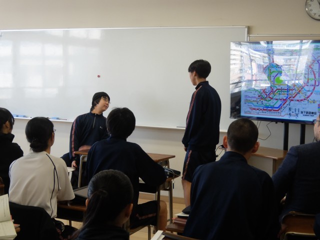 2年生の英語の授業にお邪魔しました。2年生では電車の乗り換え案内の表現を使ったスキットの発表会を行っていました。ただ話すだけではなく、自分たちでいろいろなシチュエーションを考え、演じることによってより英語の表現が身に付きますね。