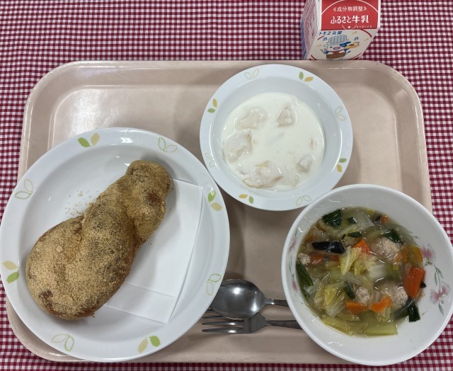 今日は1年7組3班の作成献立です。大好きなメニューをたくさん詰め込んだ大人気メニューです。ポイントは、①全体的に洋食でまとめ、人気メニューながらも栄養がとれるようにしたところ、②みんなが好きなメニューで食べ残しが少なくなるようにしたところ、だそうです。狙い通り、とてもよく食べてくれました!!