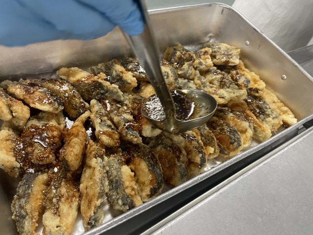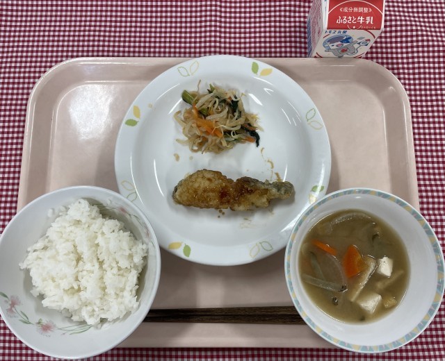 今日は今年度3回目の「学び舎給食」です。テーマは「ごはんに合う各校のおすすめメニュー」で、今回は船橋小学校のおすすめメニューでした。衣をつけて揚げた白身魚にごま入りのたれをかけていただきました。魚は甘辛でにんにくのアクセントが効いた味付けで、ごはんが進みました!次回(2月予定)の学び舎給食は、ふなきぼが担当です!