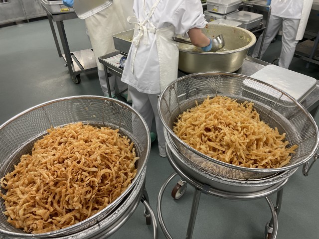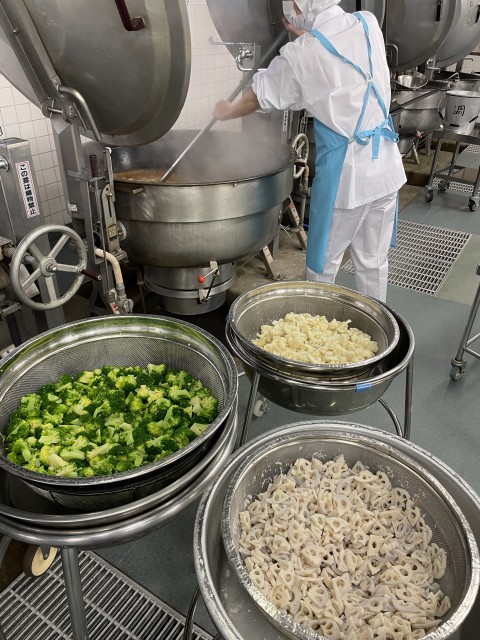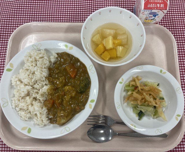 今日はすべてリクエスト給食で上位に輝いたメニューです。どれも人気な組み合わせなので、おかわりの行列がたくさんできていました。カレーライスには、定番の野菜のほかに冬野菜のブロッコリーやカリフラワー、れんこんなどが入っています。パリパリサラダのパリパリは、餃子の皮を細く切って揚げています。パリパリさを保つために野菜とは仕切りをつけて食缶に配膳しました。
