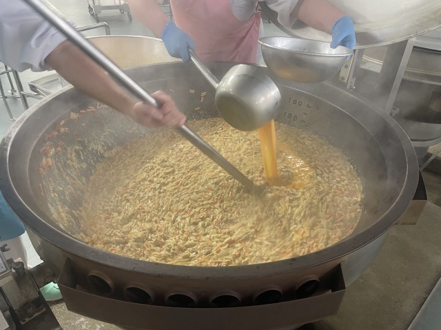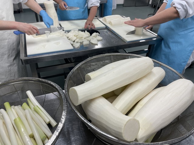 今日は図書コラボ~物語給食~で、天川栄人さんの『わたしは食べるのが下手』から、親子丼が登場しました。写真のように、親子丼は片栗粉でとろみをつけてから、溶き卵を入れてふわっと仕上げています。おみそ汁に入る大根はせたがやそだちの大根でした。瑞々しくてやわらかい、立派な大根でした。