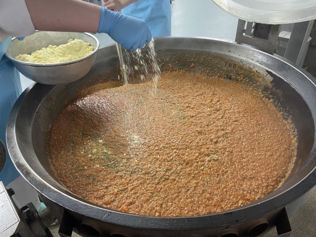 今日は学校給食週間の3日目です。昭和中期をイメージしたもので、当時は麺というとソフト麺が提供されていました。ですが、本校が契約している麺屋さんでソフト麺の取り扱いがなかったため、通常通りのスパゲティにしています。スパゲティは炒めたたまねぎと炒め合わせて麺同士がくっつきにくくしています。3枚目の写真はミートソースの仕上げに粉チーズを振り入れているところです。