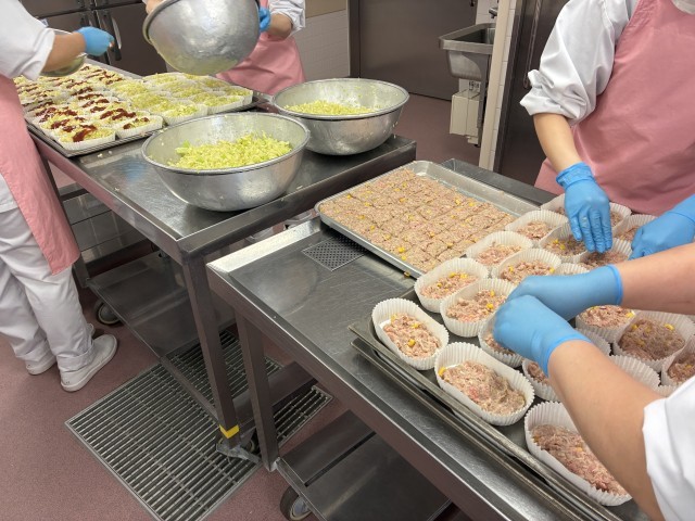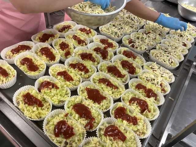 今日のロールキャベツ風は、ハンバーグのタネに、キャベツをのせ、ソースをかけてからチーズとパン粉をのせて焼く、というとても手順の多い料理です。まるでキャベツで包まれ、ソースで煮込まれたような仕上がりになりました。おかわりもたくさんしてくれました。