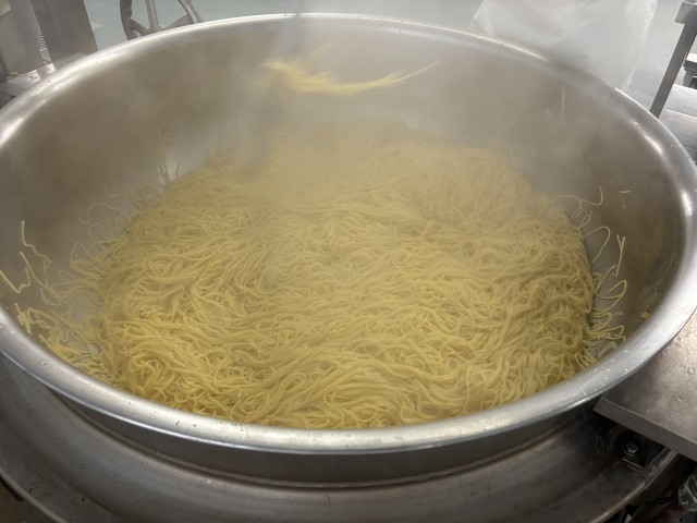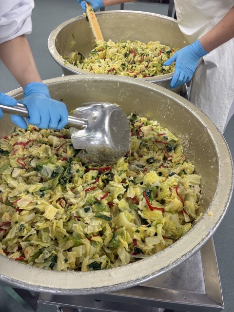 スパゲティは麺がくっつきにくいように、油で炒めた玉ねぎと合わせて配缶しています。全部で140kgくらいの量になるので、3回に分けて学年ごとに作っています。サラダは、通常のサラダの上に、揚げた大豆をのせて、サクサクした食感を楽しめるサラダにしました。