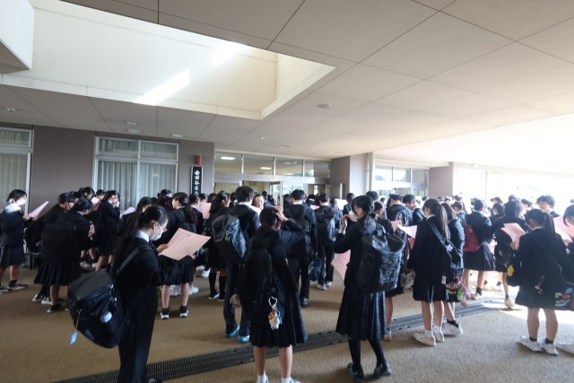ピロティで新しいクラスの名簿を受け取り、体育館で始業式が行われました。
