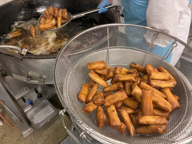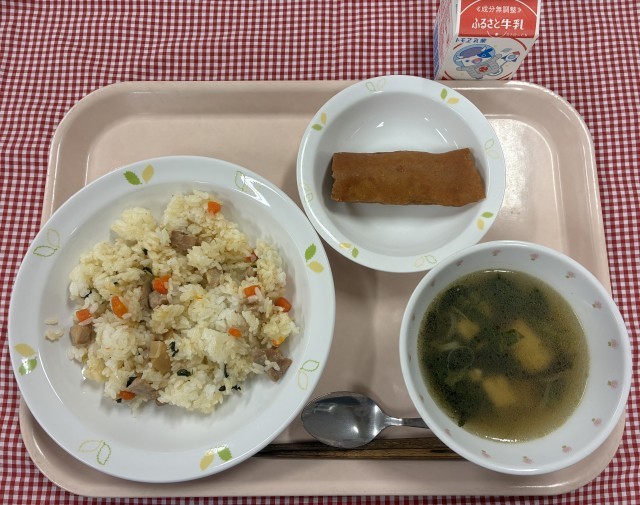 チャーハンに入るチャーシューは、角切りの豚肉に下味をつけてオーブンで焼いています。手作りのチャーシューなので、おいしくてボリュームがあります!春巻きも一つずつ手で巻いて心を込めて作りました。大量の油で揚げるとカリッと仕上がります。小学校より量が増えているとは思いますが、1年生もとてもよく食べてくれていました。