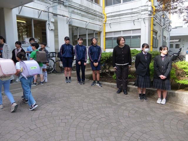 生活委員が中心になり、学舎の小学校3校に行き、校門で小学生と一緒にあいさつをしています。