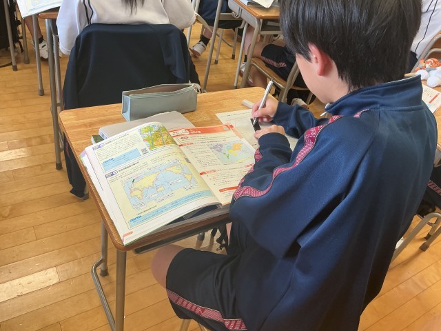 1年生の地理では世界の略地図の描き方と国名テストへ向けての対策を始めました。地図を描いてみると現実と大きく異なるところが分かります。そこは自分にとって関心が少ないところと言われています。これから重点的に学習しましょう。