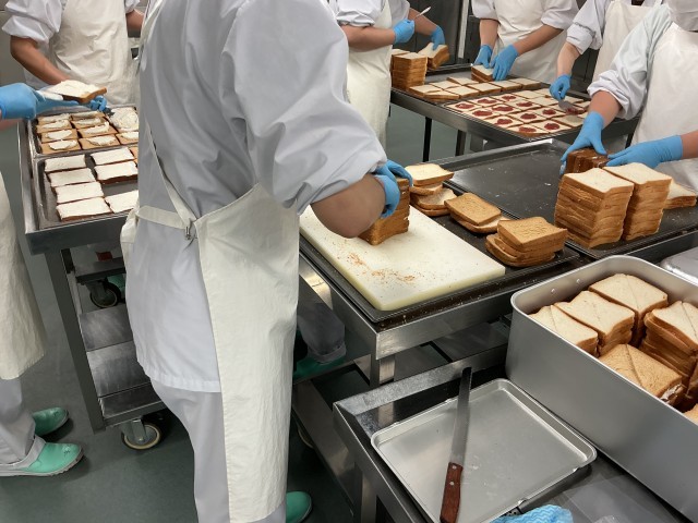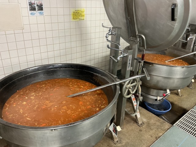 2色サンドの中身は、黒砂糖食パンにクリームチーズ、プレーン食パンにイチゴジャムが挟んであります。パンの端っこまで丁寧に塗ってくれているので、端っこまでおいしく食べられました。ビーンズシチューは2つの大きな釜を使って作っています。ベーコンや鶏肉、ケチャップや中濃ソースがたっぷり入るので、コクやうま味がしっかり感じられました。