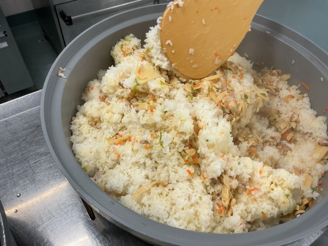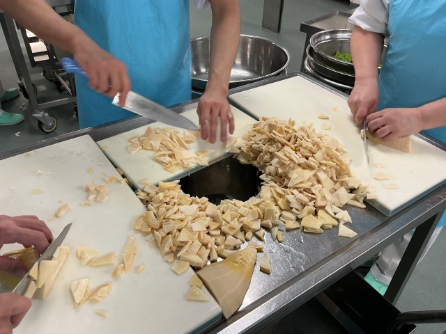 今日は新鮮な新たけのこを使ったたけのこごはんです。八百屋さんで採れたてのたけのこを薪で沸かしたお湯でゆでて納品してもらっています。旬のたけのこは、食感がよく香りも抜群でした。新じゃがいもやさやえんどうも入り、春の味覚を楽しめました。