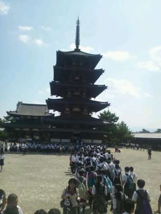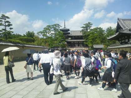 12時20 分に法隆寺に到着し、集合写真撮影、見学を終え、14 時に法隆寺を出発し、奈良公園に向っています。
