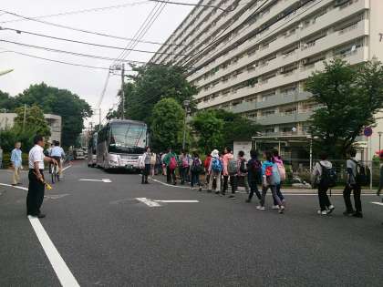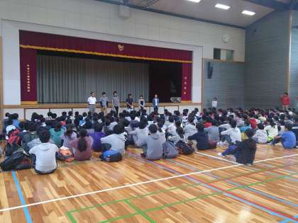 体育館で出発式を行い、8時06分に出発しました。参加生徒は208名です。移動教室のスローガンは、「挑戦×努力=感動」です。