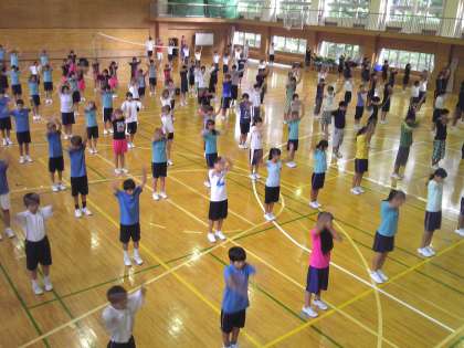 突然の雨に、朝礼を体育館に変更しました。今日は、1日の活動です。頑張ります。