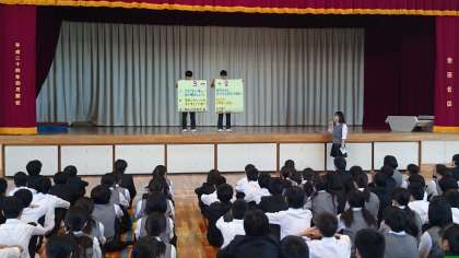 それぞれのクラスの学級委員が「こういうクラスにしたいからこういうことをがんばりたい」という決意を話しました。その後、先日の学級委員会で話し合った学年の「3つの誓い」を発表しました。