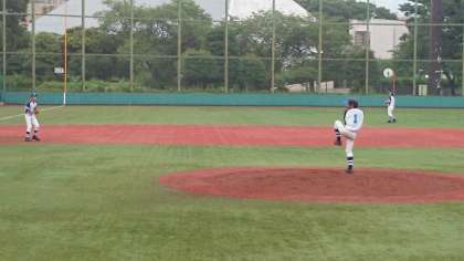 野球部が砧総合グランドで夏季大会を行っています。三回が終わってリードしています。がんばってください。(副校長)