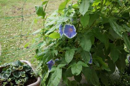 ネットの下の方にははやくもアサガオが巻き付き、花を咲かせています。