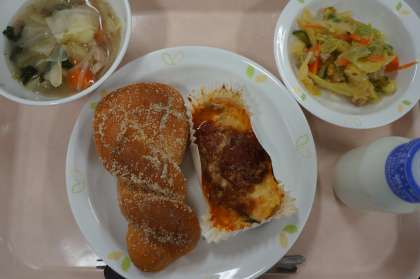 セサミ揚げパン ベーコンと野菜のスープ煮 魚のピザ風 ソーセージ入りサラダ