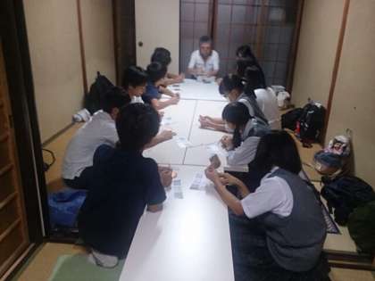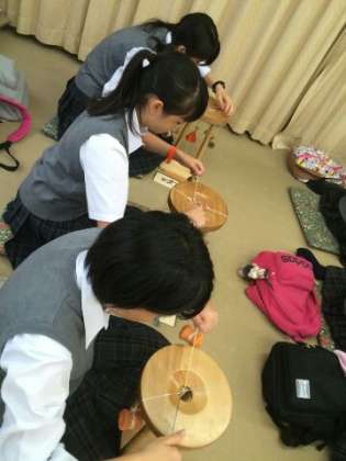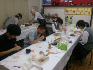 雨の中、順調に班行動が進んでいるようです。清水焼、西陣織、京像巌、くみひもストラップ、京菓子 、八つ橋漆器加飾、数珠、京友禅等の体験学習にも熱心に取り組んでいます。写真は、匂い袋、漆器加飾、くみひもストラップ作りの様子です。