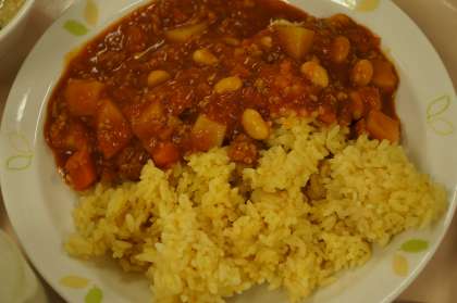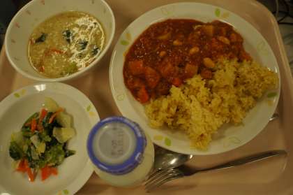 チリビーンズライス チーズのふわふわスープ キャベツと青菜のサラダ