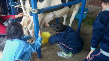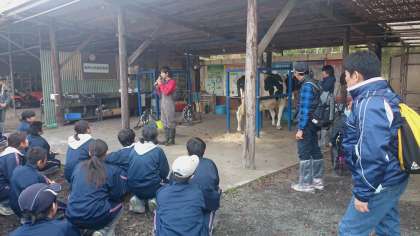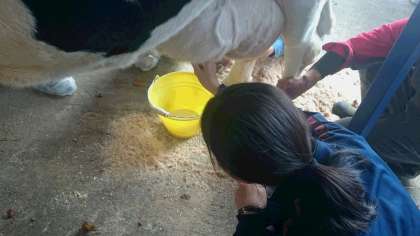 牧場に到着しました。酪農体験をします。乳しぽりを体験しています。(副校長)