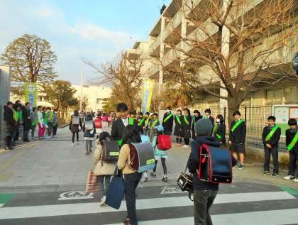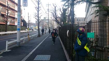 本校の生徒会役員や生活委員の生徒たちも小学校の校門で元気なあいさつを頑張りました。