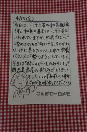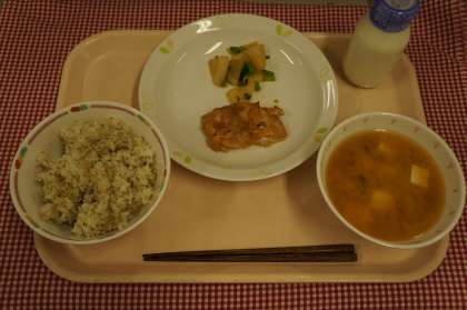 じゃこと青のりごはん 新じゃがいものみそ汁 鶏肉の照り焼き かぶのレモン漬け
