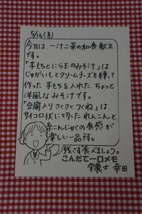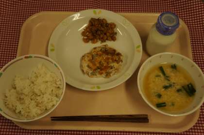 ごまごはん 芋餅とにら玉の味噌汁 豆腐入りさくさくつくね 大豆とじゃこの甘辛揚げ