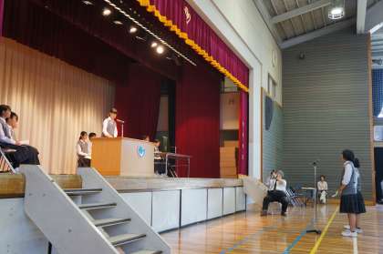 校長先生のお話のあとに、生徒会、学年学級委員会、各委員会が議案書を読み上げ、生徒の承認を受けました。