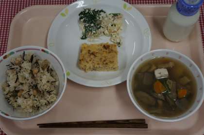 豆入りひじきごはん けんちん汁 切干大根入り卵焼き 青菜とりんごの白和え