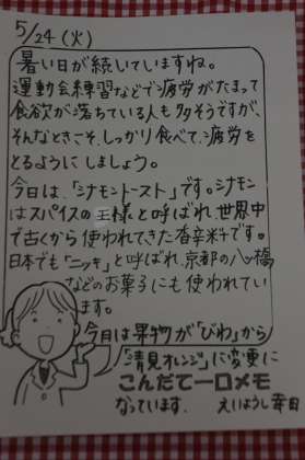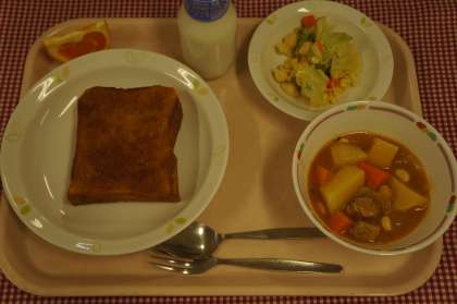シナモントースト ビーンズシチュー マカロニサラダ びわ