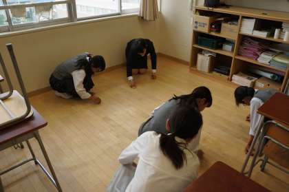 4月からたまった教室の床の細かい汚れを、ボランティアで残っていた生徒たちが磨いていたのです。