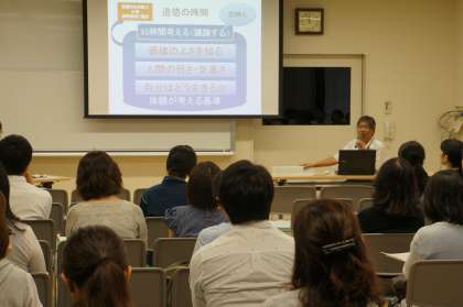 特別な教科 道徳についての背景と目標、そして効果的な授業にするための導入、発問、板書、終末のポイントと話し合いの重要性についてお話しいただきました。