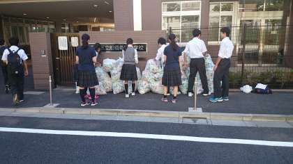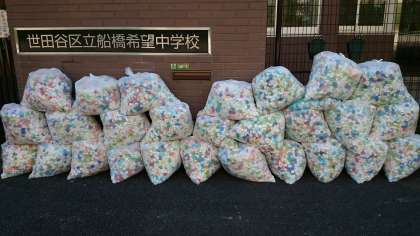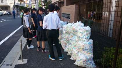 各クラスで集めたペットボトルキャップを本日、回収する業者の方に引き渡します。