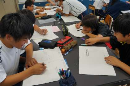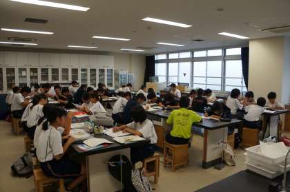 朝はあいにくの雨で、ソフトテニスボール部はみんなで夏休みの宿題や課題に取り組んでいます。