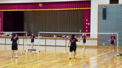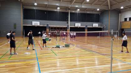午後はバドミントン部です。水分補給と休養をとりながらがんばっています。他に吹奏楽部も活動しています。