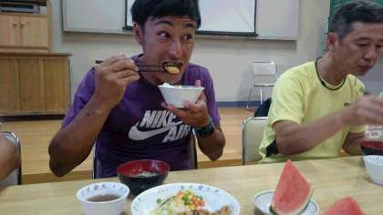 夕食です。今日の夕食のメニューは合宿でしか食べることができません。稲見先生もヒレカツを美味しそうに食べています。(副校長)